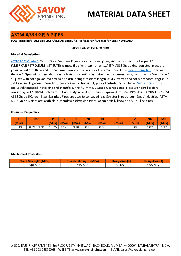 Pdf Astm A333 Grade 6 Pipe A333 Grade 6 Seamless Pipe A333 Grade 6 Pipe Supplier Savoy Piping Inc Academia Edu